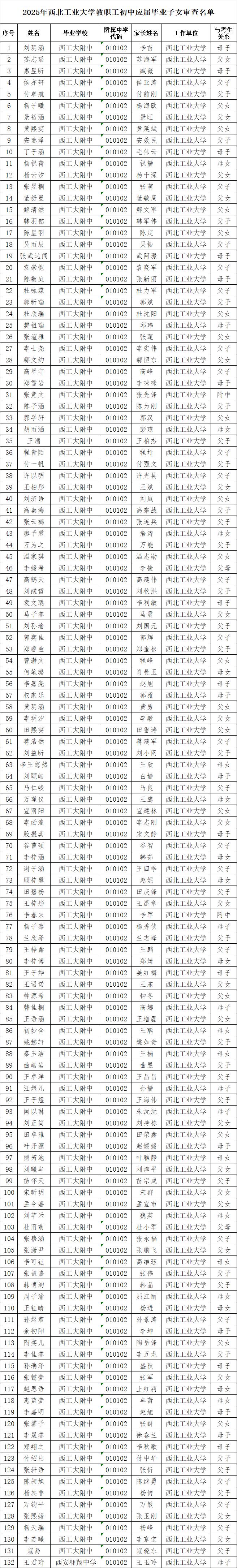 按照西安市教育局关于2025年中招事业办学单位教职工子女审查工作通知的要求,现将西北工业大学教职工子女名单公示如下,如有异议,请于2025年5月21日18:00前向西北工业大学附属中学办公室反映。